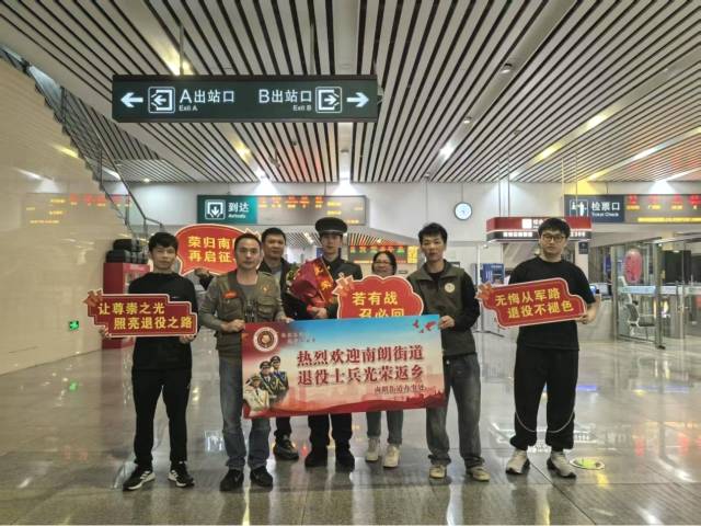 當天,街道退役軍人服務中心工作人員早早守候在出站口,現(xiàn)場“熱烈歡迎退役士兵光榮返鄉(xiāng)”“榮歸南朗 再啟征程”等橫幅高懸,氣氛莊重而溫馨。當身著戎裝、英姿颯爽的退役士兵陸續(xù)走出抵達通道,等候多時的工作人員與家屬立即上前,獻上鮮花、披上綬帶,用熱烈的掌聲和親切的問候迎接最可愛的人回家?!靶量嗔耍 薄皻g迎回家!”一句句暖心話語,驅(qū)散了旅途疲憊,更讓尊崇之光閃耀歸途。