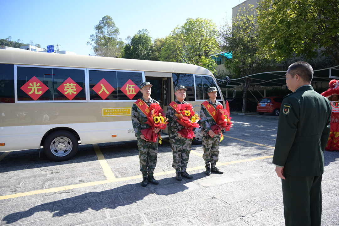 葉陽浩、胡家威兩名準(zhǔn)新兵身披“光榮入伍”的紅色綬帶和大紅花昂首挺胸站在太陽下,新兵家屬前來歡送?!瓣柡频奶檬迨?、外公和叔公都曾應(yīng)征入伍,他能進(jìn)部隊(duì)得到鍛煉,我們作為他的父母感到很光榮、很幸福?!比~陽浩的父母胸戴“光榮家屬”的大紅花,露出激動(dòng)的笑容。