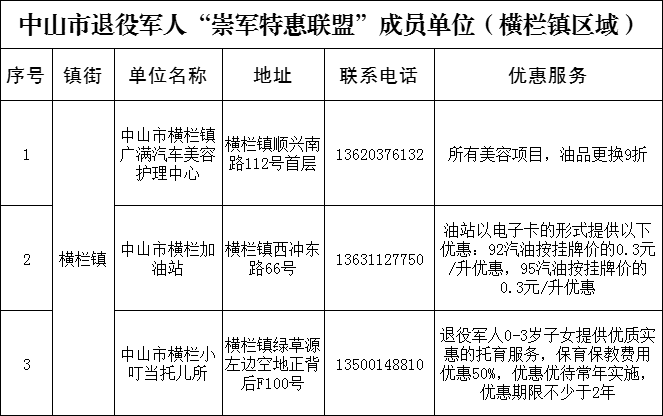 為貫徹落實(shí)習(xí)近平總書記關(guān)于退役軍人工作重要論述精神,加強(qiáng)退役軍人保障工作,我市決定組建中山市“崇軍特惠聯(lián)盟”。橫欄鎮(zhèn)迅速行動(dòng),以“讓退役軍人得實(shí)惠,讓軍人職業(yè)受尊崇”為宗旨,秉持“自愿參與、志愿服務(wù)、優(yōu)質(zhì)規(guī)范、合作共贏”原則,分批次招募聯(lián)盟成員單位,為廣大退役軍人提供價(jià)格優(yōu)惠產(chǎn)品、優(yōu)先優(yōu)待服務(wù)。12月2日,橫欄鎮(zhèn)首批3家“中山市退役軍人崇軍特惠聯(lián)盟”商家正式掛牌。