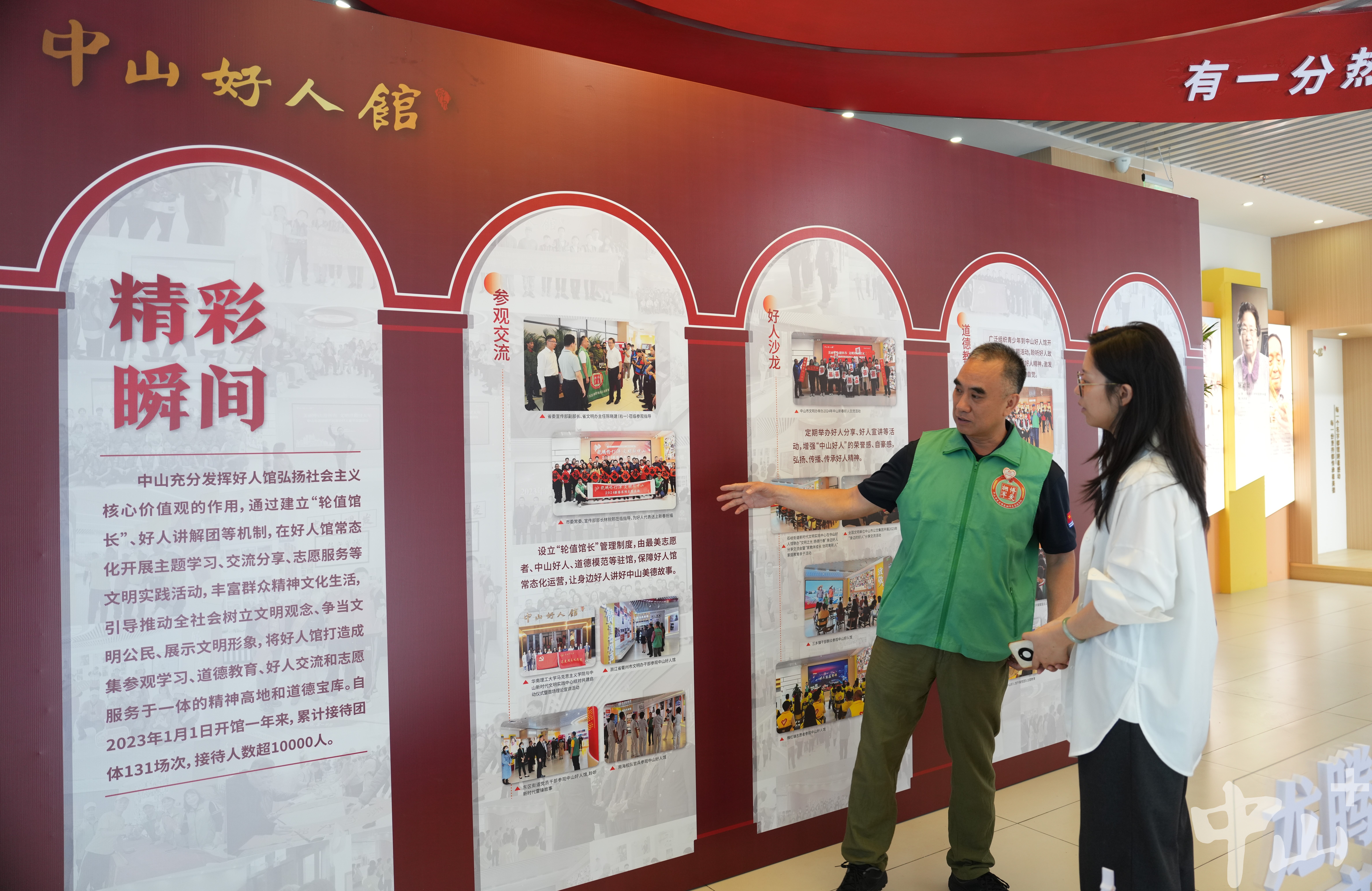 作為一名退伍軍人,李克有很多曾一起在戰(zhàn)場上出生入死的戰(zhàn)友,其中不乏已經(jīng)為國捐軀的烈士。自2007年起,他便自發(fā)組織尋找犧牲的中山籍戰(zhàn)友,先后6次帶隊(duì)前往廣西邊境的多個(gè)烈士陵園,成功尋到29名犧牲戰(zhàn)友信息,并將相關(guān)信息報(bào)送給中山市退役軍人事務(wù)局。 “我有一位戰(zhàn)友,寧愿把生的希望留給其他人,19歲不到就犧牲在戰(zhàn)場上。他們已經(jīng)離我們而去,更重要的是我們能為他們做些什么。所以逢年過節(jié)我都會(huì)看望他們的家人,把歡樂也帶給老人家。”李克說。 2016年,得知戰(zhàn)友的女兒患先天性心臟病,須進(jìn)行心肺聯(lián)合移植手術(shù),李克立即帶頭捐款,并聯(lián)系政府相關(guān)部門和電視臺(tái),通過媒體報(bào)道讓更多愛心人士關(guān)注到了這位困難老兵。在他的多方奔走下,社會(huì)各界紛紛伸出援助之手,募集醫(yī)藥費(fèi)40余萬元,助戰(zhàn)友的女兒順利完成了手術(shù)。 牽頭成立志愿服務(wù)隊(duì) 延續(xù)志愿精神 作為一名有著30多年志愿服務(wù)經(jīng)歷的資深志愿者,李克的生活已經(jīng)與志愿分不開。他的身上始終有一抹綠色:在軍營,是守衛(wèi)國門的綠軍裝;在社區(qū),是服務(wù)群眾的綠馬甲。在人民群眾需要的地方,李克每次都沖在最前線。 “2020年疫情暴發(fā)時(shí),很多人都響應(yīng)號召待在家里,我覺得作為一個(gè)打過仗的老兵,我總得站出來做點(diǎn)事。”沒有過多考慮,李克第一時(shí)間加入到了志愿者隊(duì)伍中,并在社區(qū)堅(jiān)守了整整60天。當(dāng)時(shí)防護(hù)物資匱乏,李克還自掏腰包托人在廣州購買了6萬元左右的防護(hù)物資,全部捐贈(zèng)給了在一線抗疫的工作人員。 近年來,李克還積極捐資助學(xué)、支援災(zāi)區(qū)、扶危濟(jì)困,連續(xù)6年資助6名困難學(xué)生,為汕尾市陸河中學(xué)捐贈(zèng)10套多媒體電腦設(shè)備,堅(jiān)持參與無償獻(xiàn)血直到60歲。 2018年起,李克擔(dān)任文明城市巡查監(jiān)督員,奔走在街道各個(gè)路口、每條小巷,整理亂停亂放的共享單車,清理“牛皮癬”小廣告,保障街頭巷尾干凈衛(wèi)生。同一年,為更有組織地開展志愿活動(dòng),李克牽頭成立了一支以退役軍人為主導(dǎo)的東區(qū)博愛擁軍志愿服務(wù)隊(duì),把戰(zhàn)友們凝聚在一起,共同為社會(huì)作貢獻(xiàn)。如今,這支志愿服務(wù)隊(duì)已從最初的8名成員,逐漸壯大至400多人,成為服務(wù)社會(huì)的一支生力軍。 講好好人故事,傳承紅色文化 4月19日上午,記者在“中山好人館”見到了正在擔(dān)任“輪值館長”的李克。從去年1月開始,他每個(gè)月都參與輪值,先后為140多場活動(dòng)、1萬多名市民群眾義務(wù)講解博愛之城的凡人善舉、好人大愛。  正在中山好人館輪值的李克。記者 劉萬杰 攝