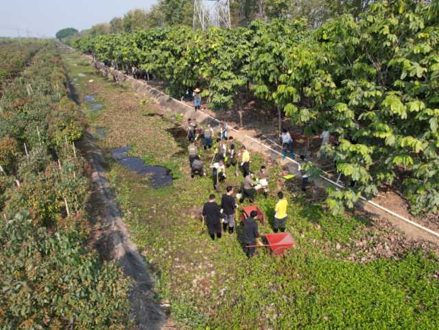 為提高清淤工作效率,結(jié)合木圍排灌渠兩側(cè)岸坡均已密植花木實(shí)際情況,本次活動采取了“挖機(jī)+人工”的清淤方式,由挖掘機(jī)將排灌渠內(nèi)雜草、淤泥集中清理堆至渠外空地,再由人工精細(xì)作業(yè),轉(zhuǎn)運(yùn)淤泥雜草至花木間區(qū)域平鋪晾曬改良土壤、增強(qiáng)肥力。