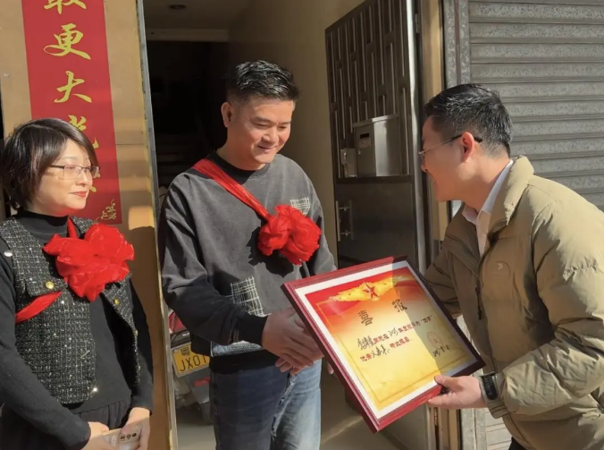 沙溪鎮(zhèn)為9名2025年度“四有”優(yōu)秀士兵家屬集中送喜。鎮(zhèn)領導率慰問組分批登門,為軍屬佩戴光榮紅花、宣讀喜報。其中,溪角社區(qū)戴維駿作為“四有”優(yōu)秀軍官,恰逢新婚在即,喜報成為一份特殊的“婚前賀禮”,既褒獎軍人貢獻,亦致敬軍屬付出。家屬們接過喜報時自豪滿溢,紛紛表示將全力支持子女安心服役、再立新功。