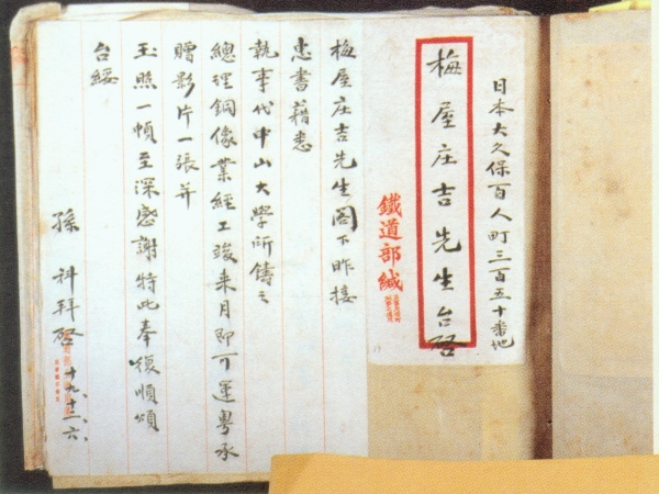 孫科因梅屋莊吉鑄贈孫中山銅像事致梅屋感謝函