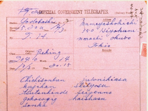 萱野長知從北京致梅屋莊吉電告知孫中山的病情