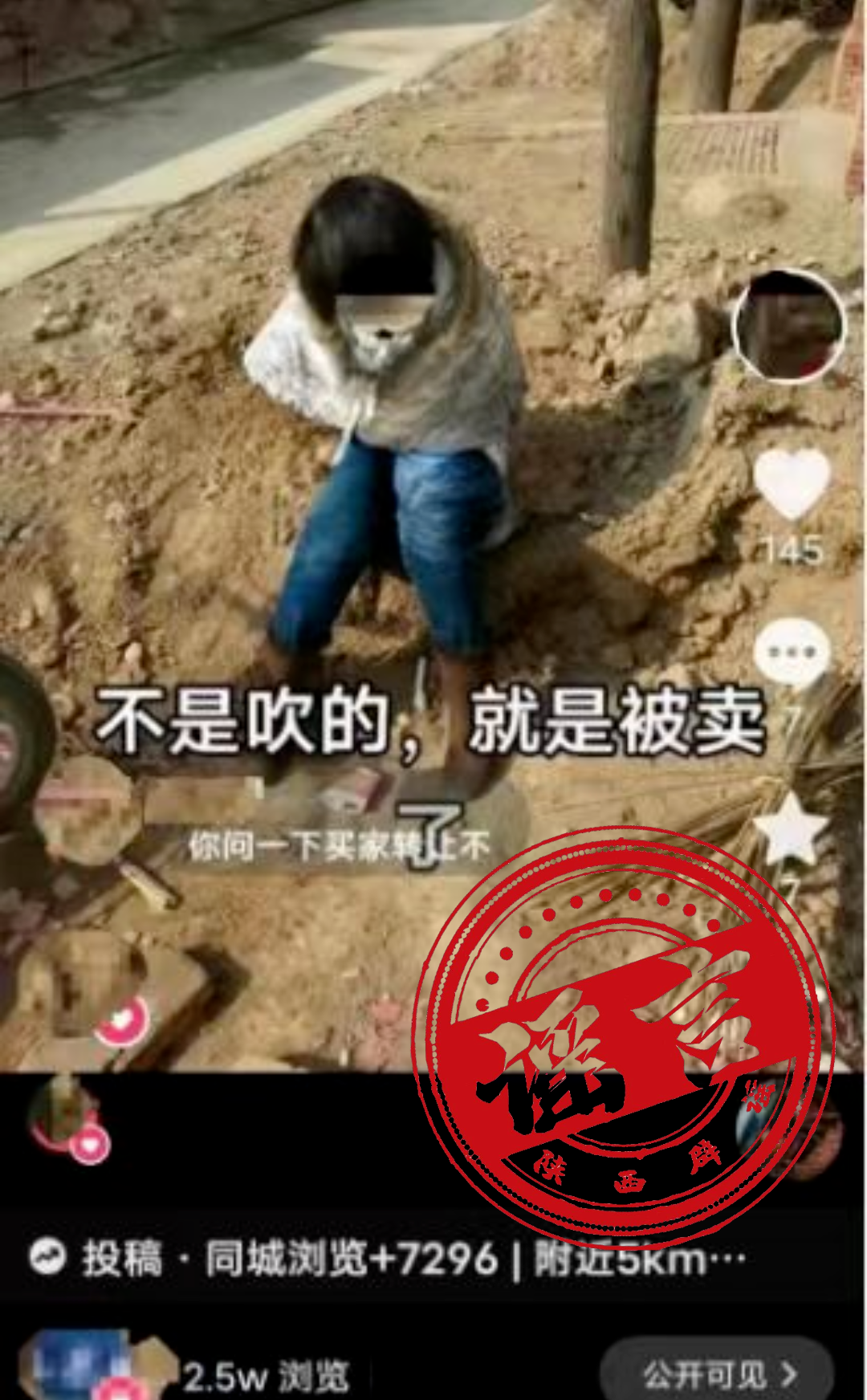 2024年1月10日,網(wǎng)民張某某(女,39歲,蒲城龍陽(yáng)人)為博取關(guān)注、吸引流量,利用了一張自己14年前拍攝坐在土堆前的照片,并配有“不是吹的,就是被賣(mài)了”的字眼制作成視頻后,發(fā)布在抖音平臺(tái)上,同時(shí)與網(wǎng)民互動(dòng)交流,先后有超過(guò)2.5萬(wàn)人次瀏覽。
