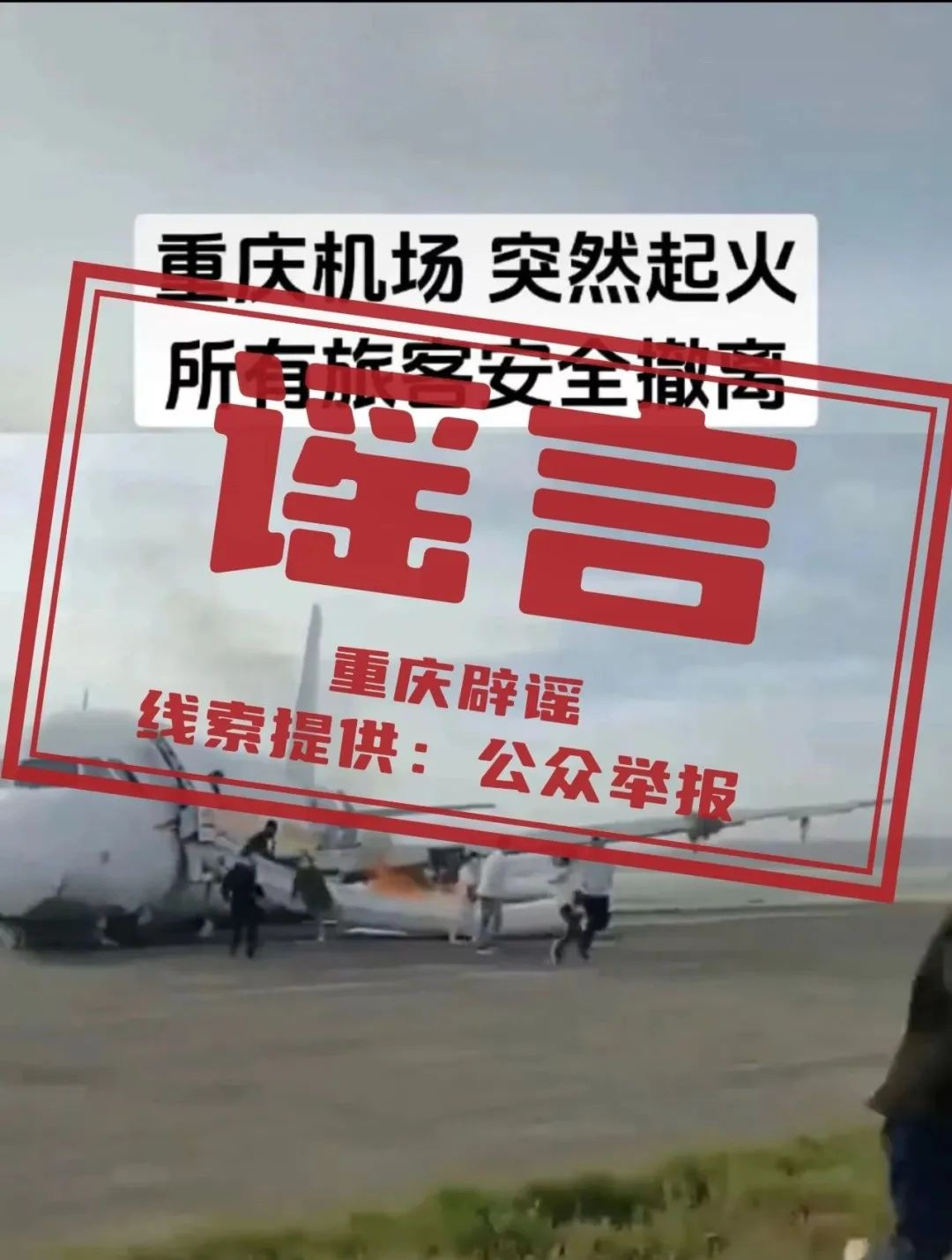 網(wǎng)傳信息為發(fā)布于某網(wǎng)站平臺(tái)的一條短視頻,視頻畫面顯示一客機(jī)停放在飛機(jī)跑道上,不少乘客正從飛機(jī)客艙中跑出,并配文稱“重慶機(jī)場(chǎng)突然起火,所有旅客安全撤離”。