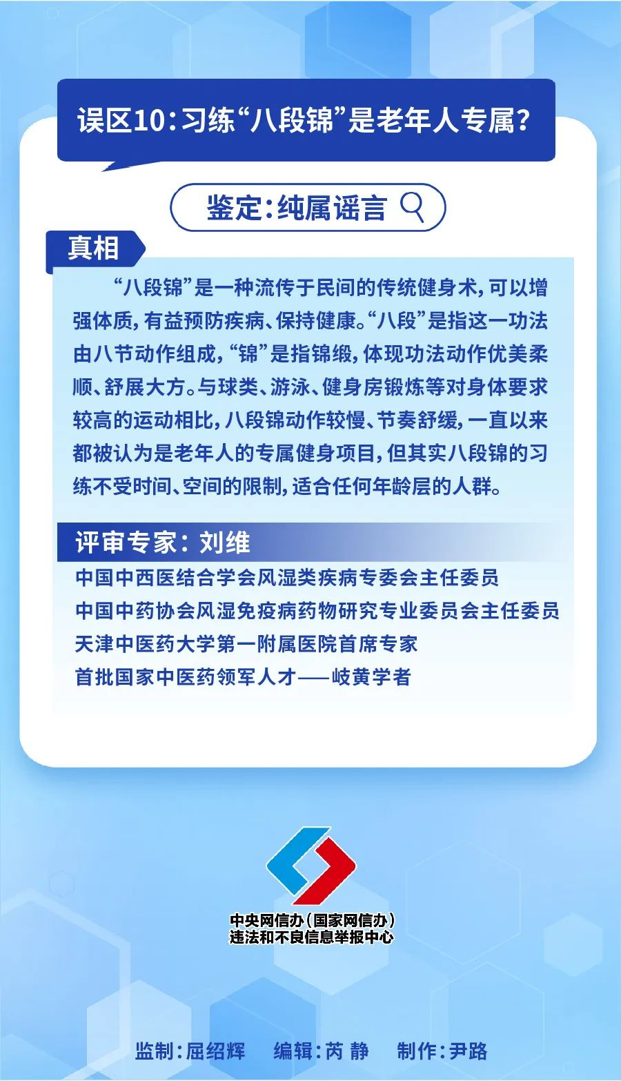 為守護人民群眾生命健康,中國互聯(lián)網(wǎng)聯(lián)合辟謠平臺、中國醫(yī)師協(xié)會聯(lián)合發(fā)布《2023年度十大網(wǎng)絡熱議健康誤區(qū)》,澄清醫(yī)療健康、飲食營養(yǎng)、科學運動等方面的誤區(qū),幫助網(wǎng)民提升識謠辨謠能力。