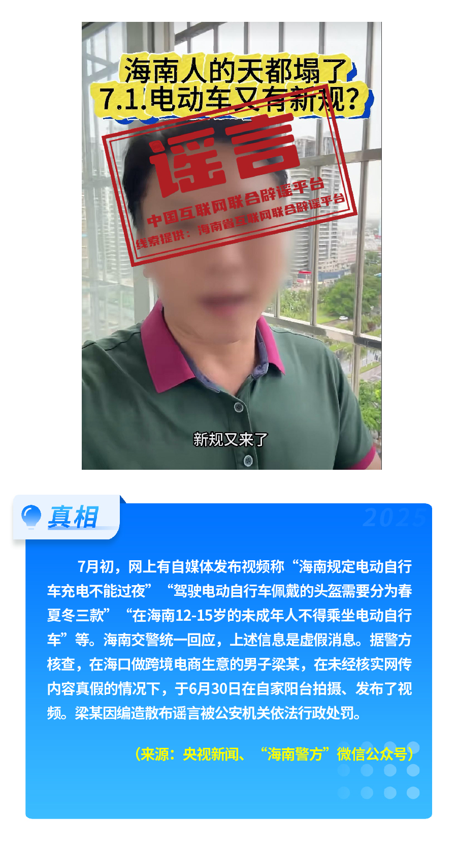有人重新翻炒“醫(yī)?!畟€人賬戶’將全部取消”舊謠,故意歪曲醫(yī)保改革真實(shí)內(nèi)涵,嚴(yán)重誤導(dǎo)公眾對醫(yī)保改革政策的理解?!坝袑H松祥T服務(wù)激活醫(yī)保碼”,披著“公共服務(wù)”的外衣,實(shí)有詐騙之嫌和安全風(fēng)險。憑空捏造“海南規(guī)定電動自行車充電不能過夜、頭盔分三季”這一“奇葩規(guī)定”,以“新規(guī)”話術(shù),擾亂交通管理秩序。