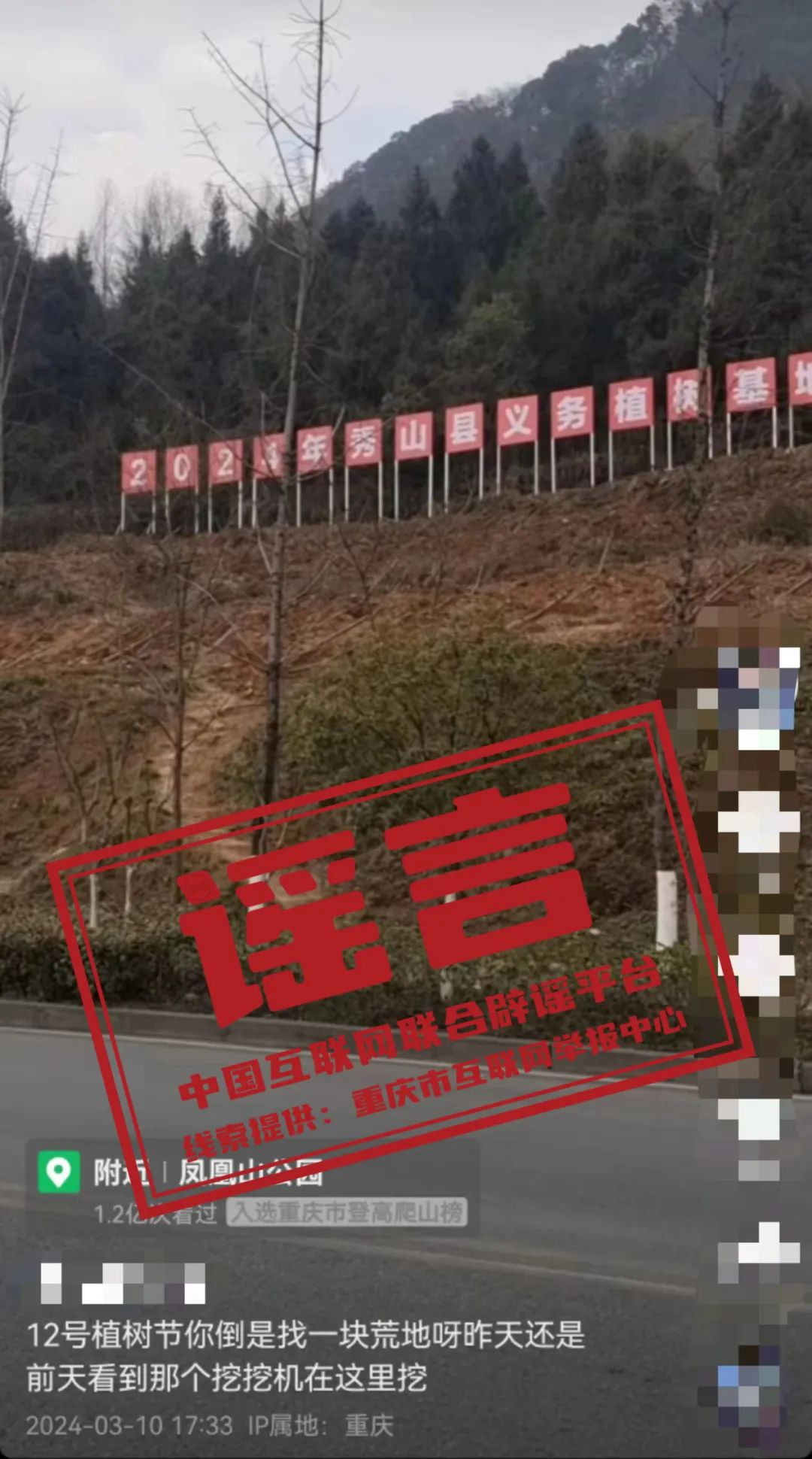 謠  重慶市秀山縣鳳凰山公園把原有樹木挖了來辦植樹節(jié)?