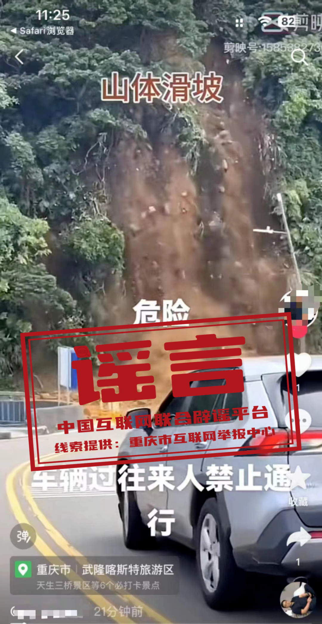 真相:近日,有網民發(fā)布了一則“山體滑坡危險,過往車輛行人禁止通行”的視頻,視頻定位標注為“重慶市武隆喀斯特旅游區(qū)”。經重慶市武隆區(qū)多部門核實,該區(qū)近期未發(fā)生大面積山體滑坡事件。網傳視頻實為2024年6月3日臺灣省基隆市中正區(qū)潮境公園入口發(fā)生的大規(guī)模山體滑坡事件,而視頻中所標注的定位信息系網民發(fā)布視頻的地點,而非事件發(fā)生的地點。(來源:“重慶辟謠”微信公眾號、網信武?。?/span>