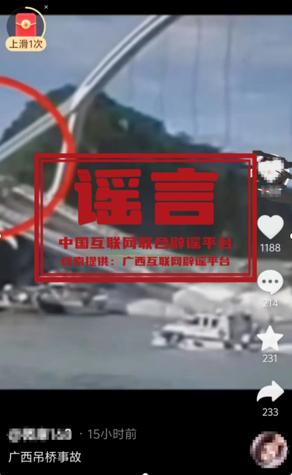 真相:近日,有網(wǎng)民在短視頻平臺發(fā)布內(nèi)容為吊橋垮塌事故的視頻,并稱該事故發(fā)生在廣西境內(nèi),引發(fā)網(wǎng)民關(guān)注。視頻顯示,一吊橋繩索斷裂導(dǎo)致橋體垮塌,一輛來不及過橋的貨車也落入水中。經(jīng)廣西互聯(lián)網(wǎng)辟謠平臺核實(shí)比對,網(wǎng)傳“廣西吊橋垮塌事故”視頻實(shí)際上為2019年臺灣南方澳大橋發(fā)生吊桿斷裂并導(dǎo)致橋梁垮塌。網(wǎng)傳視頻系移花接木造謠。(來源:“廣西互聯(lián)網(wǎng)違法和不良信息舉報(bào)中心”微信公眾號)