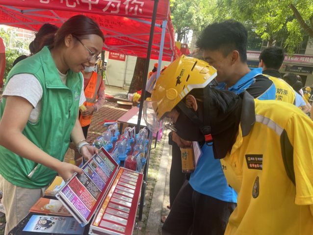 活動(dòng)伊始,梁主席為活動(dòng)致辭并給60余名外賣騎手送上夏日清涼飲料及防暑物資,對外賣騎手日常辛苦付出表達(dá)衷心感謝與深情慰問。活動(dòng)設(shè)置宣傳攤位,外賣騎手與居民群眾駐足攤位前,認(rèn)真聆聽、觀看。禁毒志愿者為大家耐心講解新型毒品的樣式及危害,并結(jié)合騎手配送場景,重點(diǎn)講解“毒駕”危害及可疑包裹識(shí)別技巧,強(qiáng)化職業(yè)群體防毒意識(shí),同時(shí)警示騎手嚴(yán)守驗(yàn)視制度,若發(fā)現(xiàn)異常訂單,請立即通過“一鍵報(bào)警”功能舉報(bào),防止涉毒食品或物資流入消費(fèi)者手中,共同筑牢外賣配送禁毒防線。